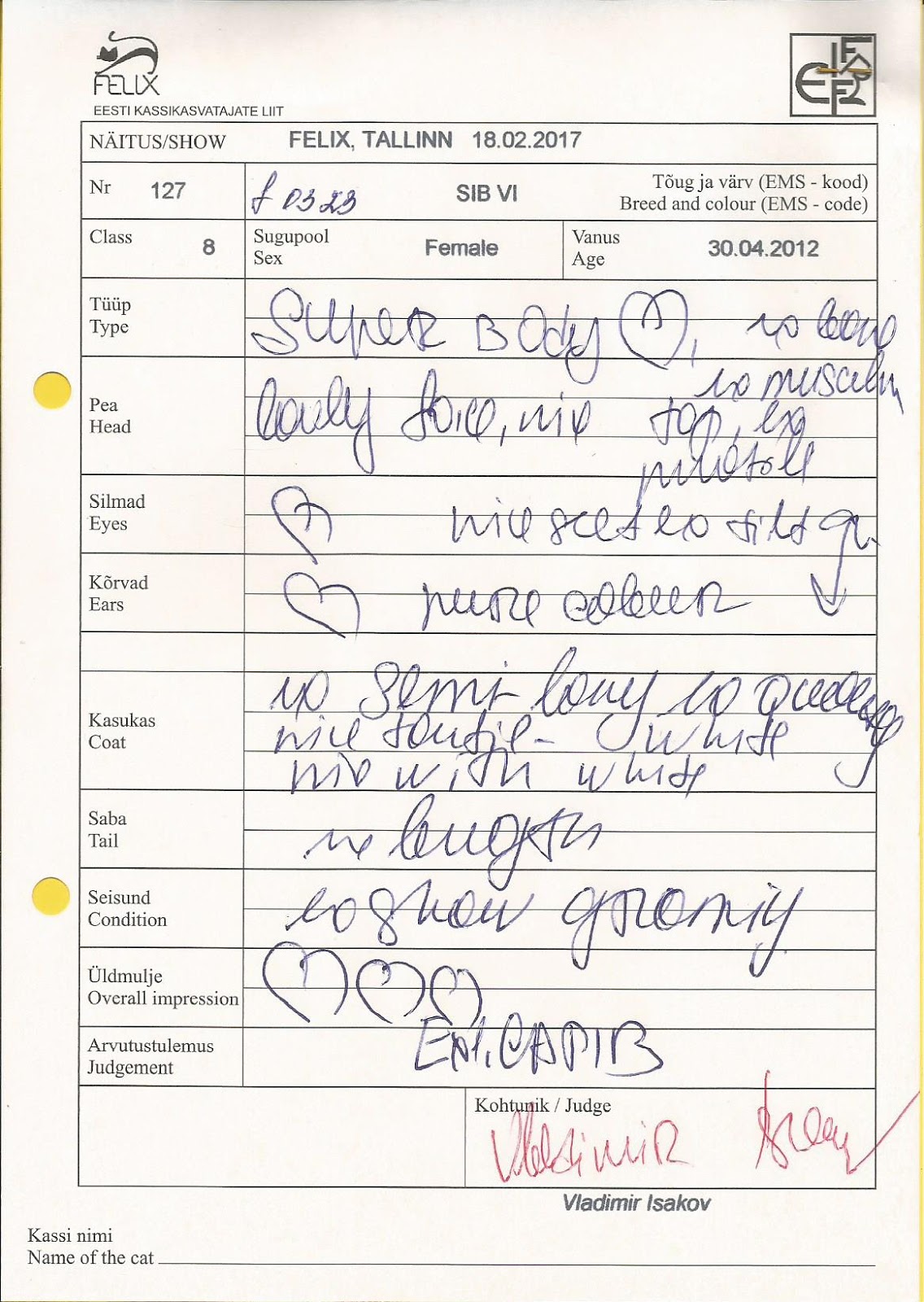 Ja niinhän siinä kävi, että KissaKaramelli "voitti" ensimmäisen vuoron. Kahden muun vuoro oli niin lähellä, että miespalvelija jäi kytikselle toiselle tuomarille, eikä KissaKaramellistä ole kuvan kuvaa pöydällä. KissaKaramelli on viimeksi ollut näyttelyssä syyskuussa 2015, eikä hää silloin tykännyt näytelmistä lainkaan! Eikä tykännyt nytkään! Jännitti niin että piti olla ihan pienesäs kasassa ja mamman helmoissa. Tuomarin käsissä vähän rentoutui ja antoi jopa tarkastella itseään. Ja serti tuli. KissaKaramelli valmistui luokasta 8 International Premiereksi, siirtyen luokkaan 6.